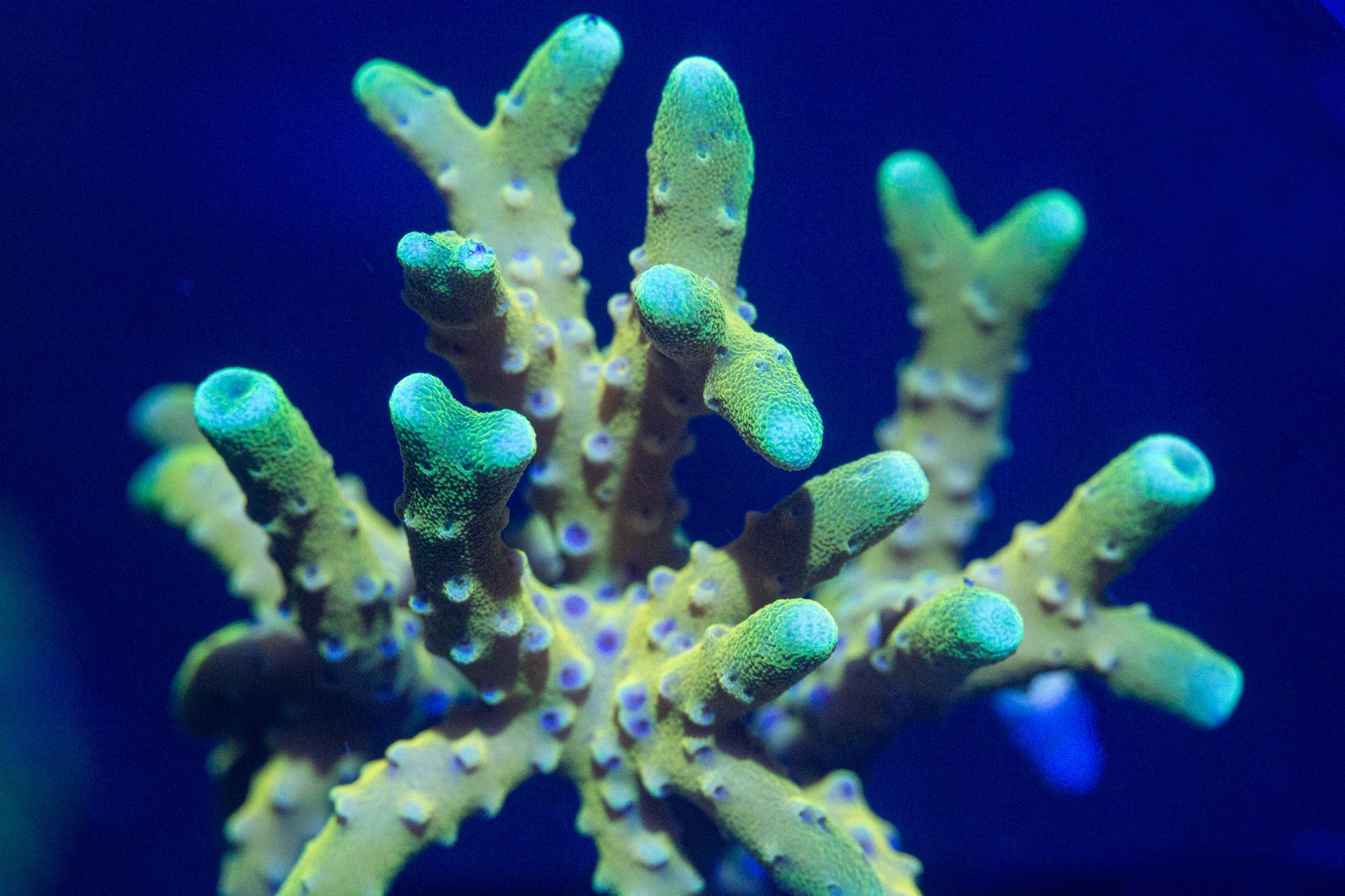 Glowing gold anacropora! Suitable for lower light than regular acros, and new to SPS friendly.